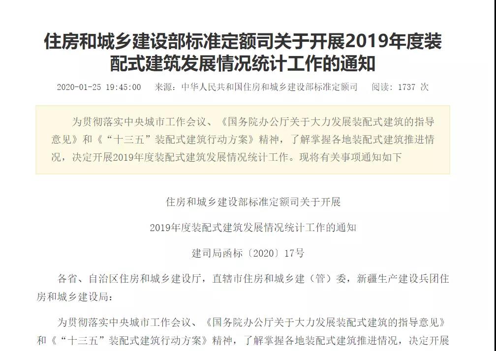 2020年1月25日,住房和城鄉(xiāng)建設部標準定額司關于開展2019年度裝配式建筑發(fā)展情況統(tǒng)計工作的通知,內容強調: